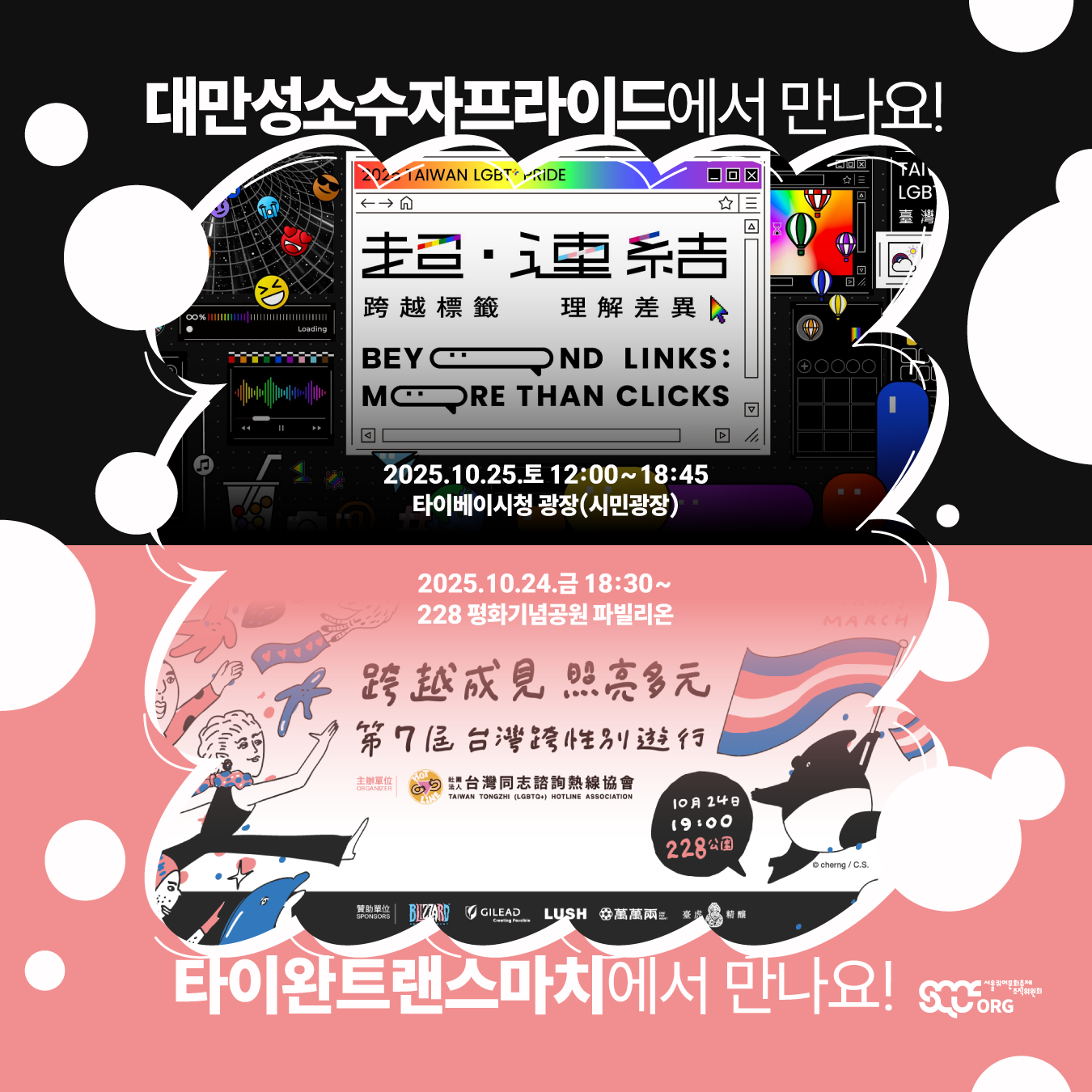 🤝 제23회 대만성소수자프라이드 & 제7회 타이완트랜스마치에 서울퀴어문화축제조직위원회가 함께합니다! 🤝서울퀴어문화축제 SQCF 2025. 10. 22. 11:36