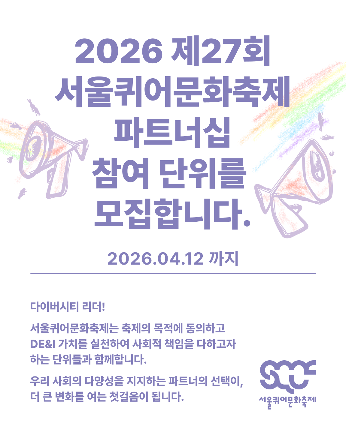 2026 제27회 서울퀴어문화축제 파트너십 참여 단위를 모집합니다. [서울퀴어문화축제 파트너십 모집 1/5](2026.04.12까지)서울퀴어문화축제 SQCF 2026. 3. 19. 17:53