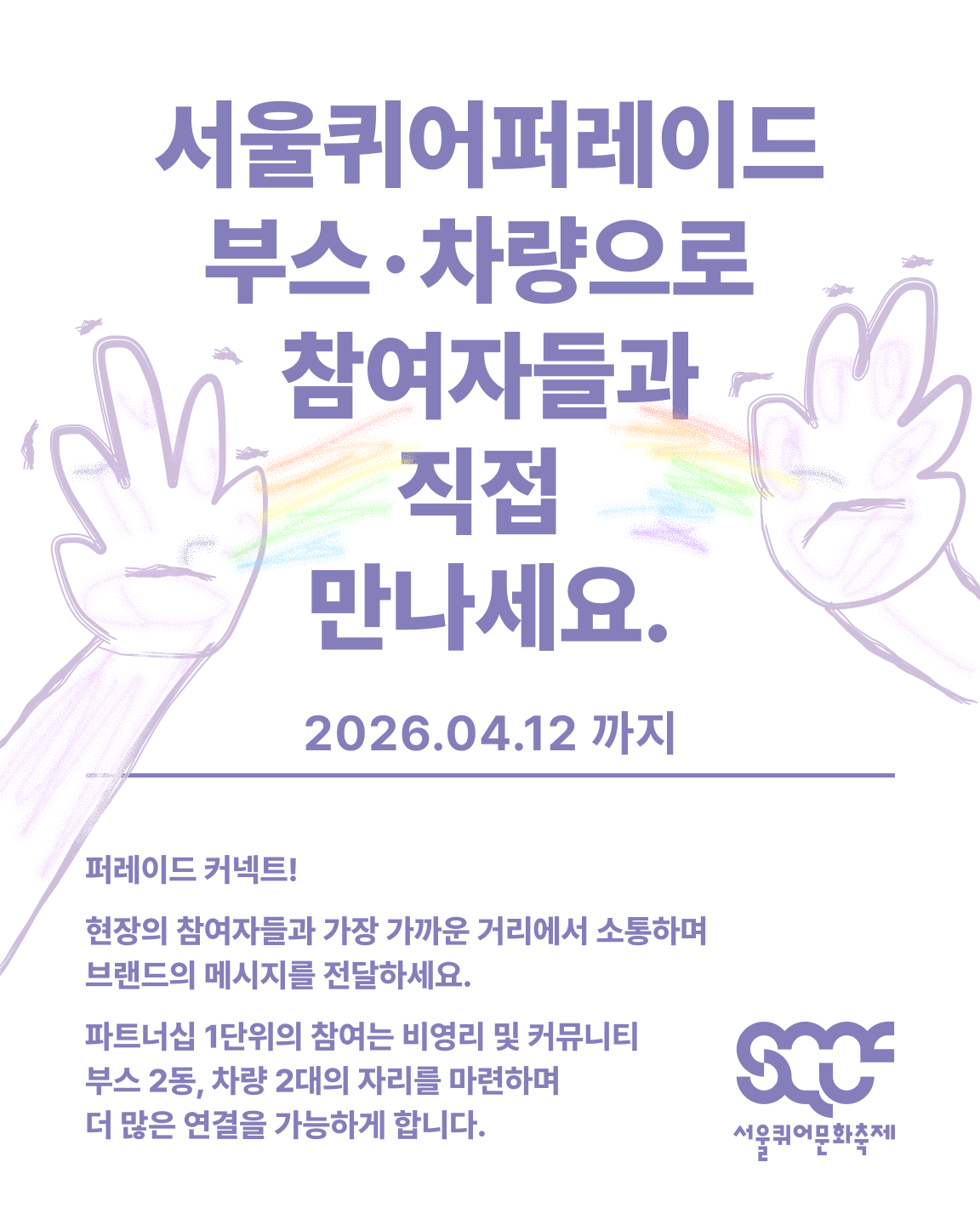 서울퀴어퍼레이드 부스·차량으로 참여자들과 직접 만나세요. [서울퀴어문화축제 파트너십 모집 2/5](2026.04.12까지)서울퀴어문화축제 SQCF 2026. 3. 20. 11:16