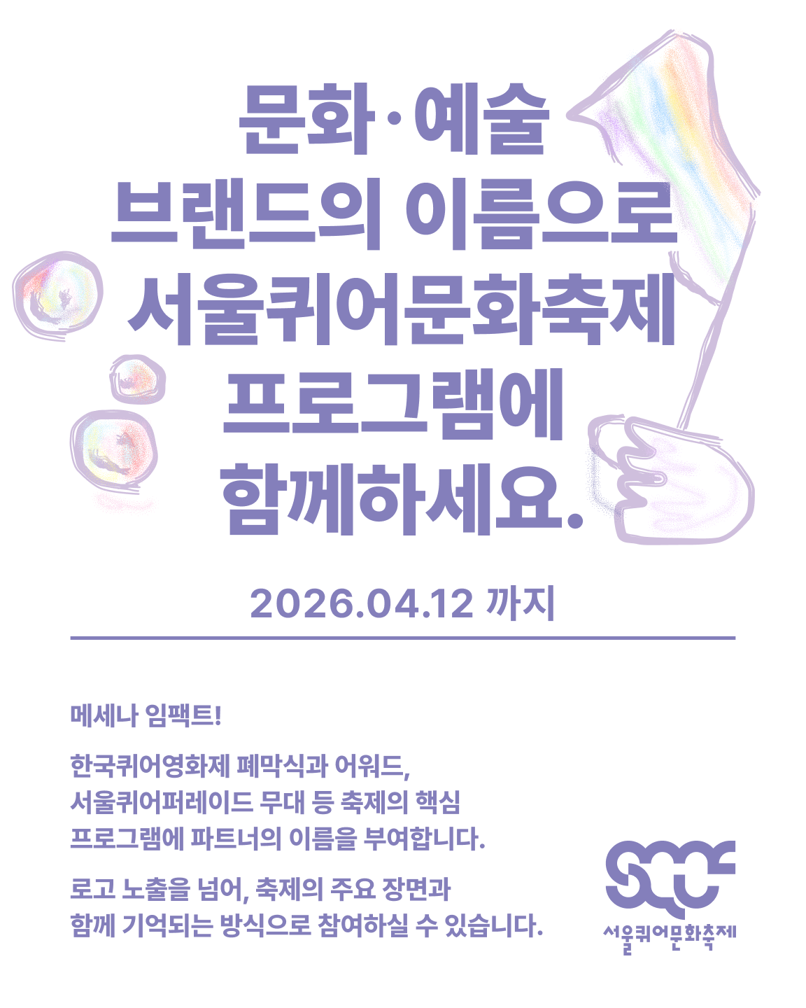 문화∙예술 브랜드의 이름으로 서울퀴어문화축제 프로그램에 함께하세요. [서울퀴어문화축제 파트너십 모집 3/5](2026.04.12까지)서울퀴어문화축제 SQCF 2026. 3. 20. 18:03